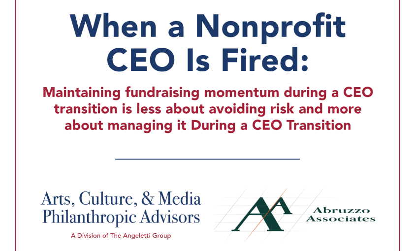 James Abruzzo – President, Abruzzo Associates Peter H. Hansen – Principal, Arts, Culture, and Media Philanthropic Advisors We’ve all read the press release: The Board announces that the President and CEO is stepping down “effective immediately,” with mutual appreciation on all sides and a national search to follow. Everyone in the field recognizes the script.